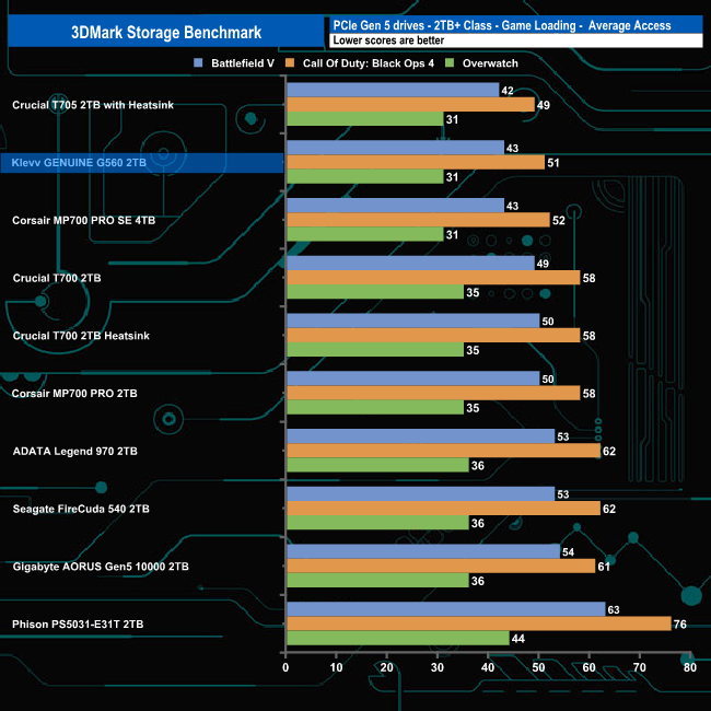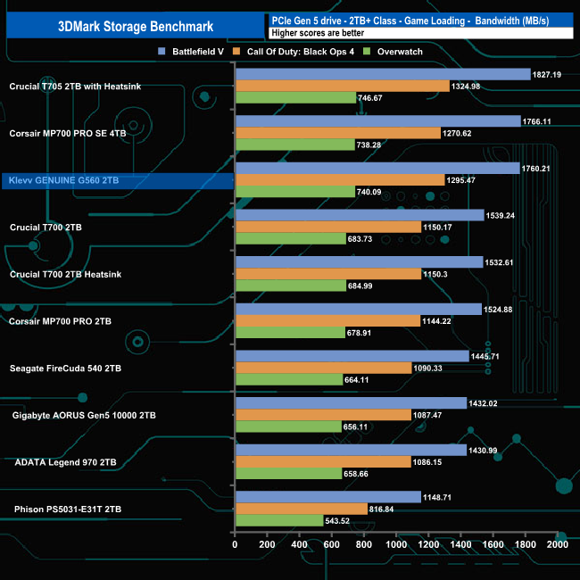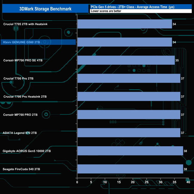 In 3DMark’s Storage Test, the drive had an average game loading bandwidth figure for the three games of 1,265.25MB/s (good enough for third place in the results table), with an average access time figure of 41µs (0.041m/s).