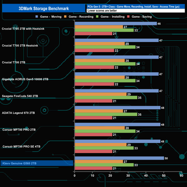 In the game moving, recording, installing and saving test traces the drive averaged 1,584.74MB/s with an average access time of 32µs (0.032m/s) for the four tests which see the drive in the penultimate spot in the table.