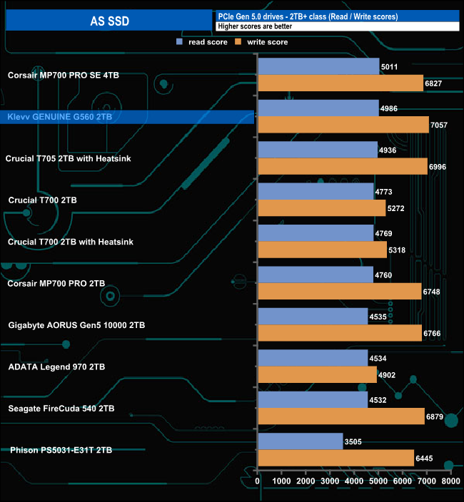 With a read score of 4986, the G560 sits in second place behind Corsair's MP700 PRO SE drive but its write score of 7057 is the fastest we've seen to date for a consumer Gen.5 drive.