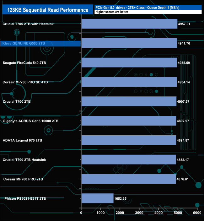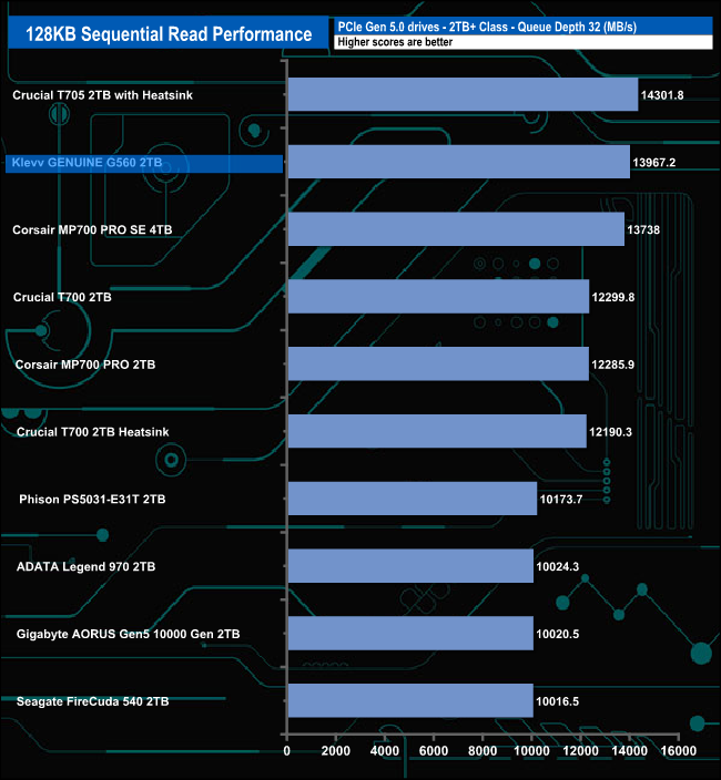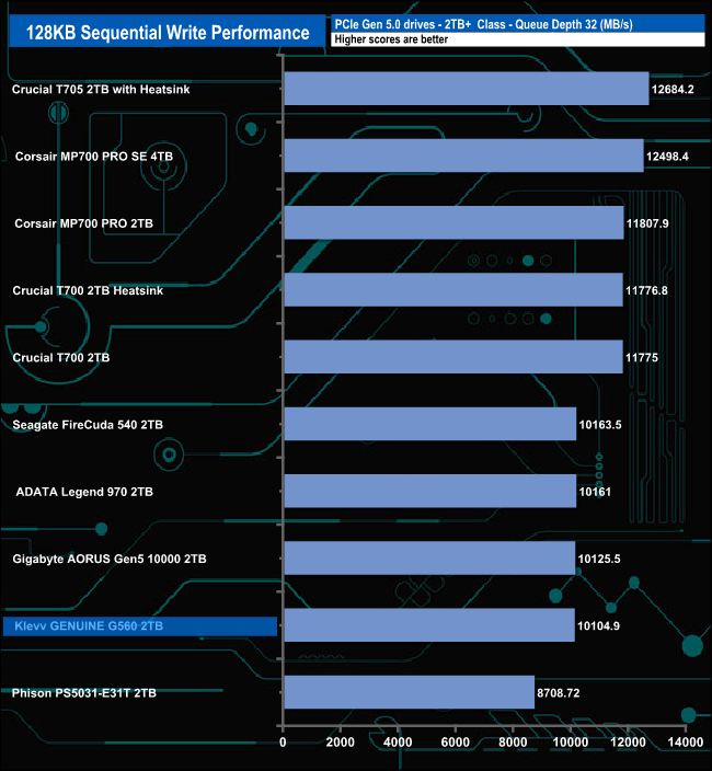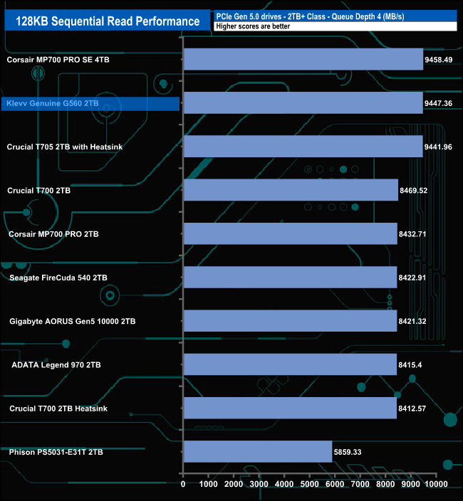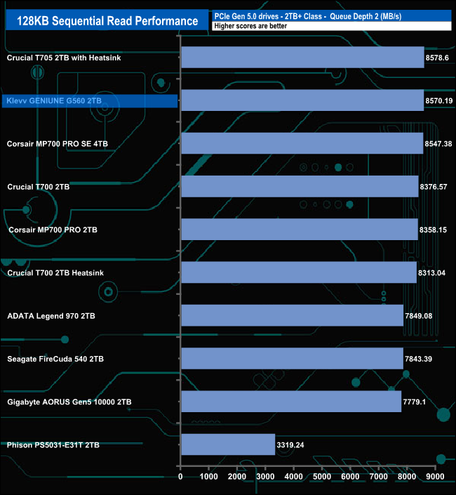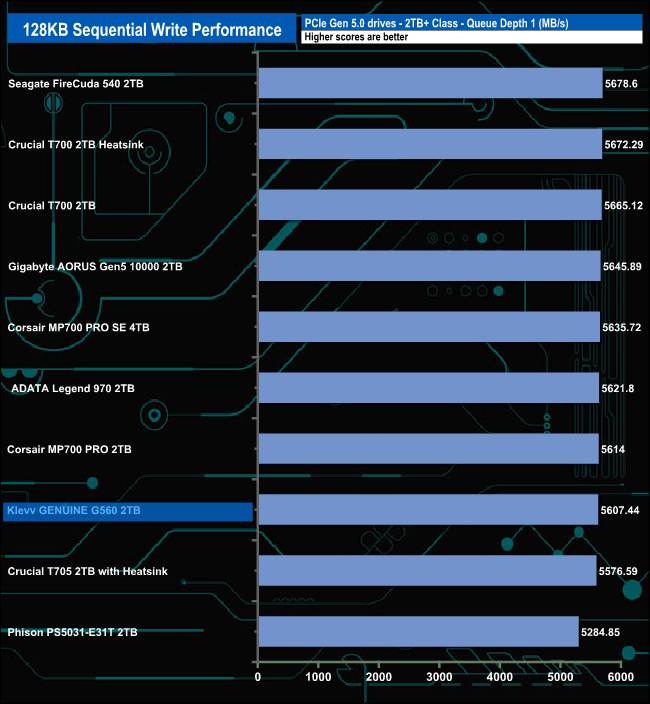 The Klevv GENUINE G560 shows very consistent read performance, sitting in second place in the results chart throughout all the tested queue depths,
