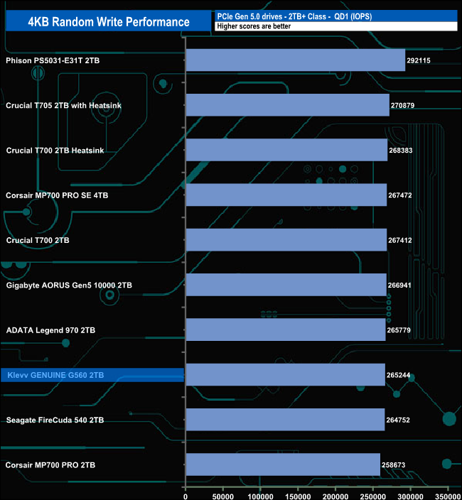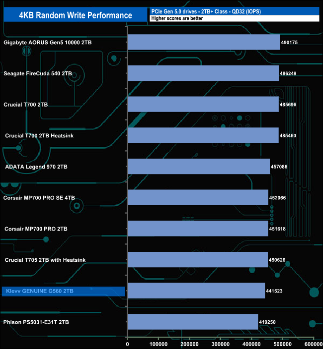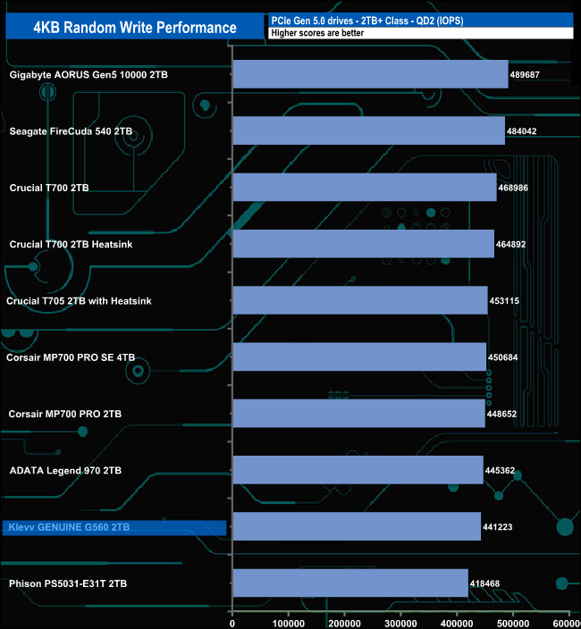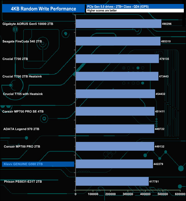 As with random reads, the G560 is rated up to 1,400,000 IOPS for random writes. Once again we couldn't get close to that figure with our 4-threaded test with a best peak result of 442,926 IOPS at QD16.