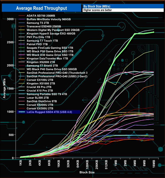 Even though the peak read figure of 2,714.67MB/s is well short of the official maximum figure, it's still the second fastest external drive we've seen to date.