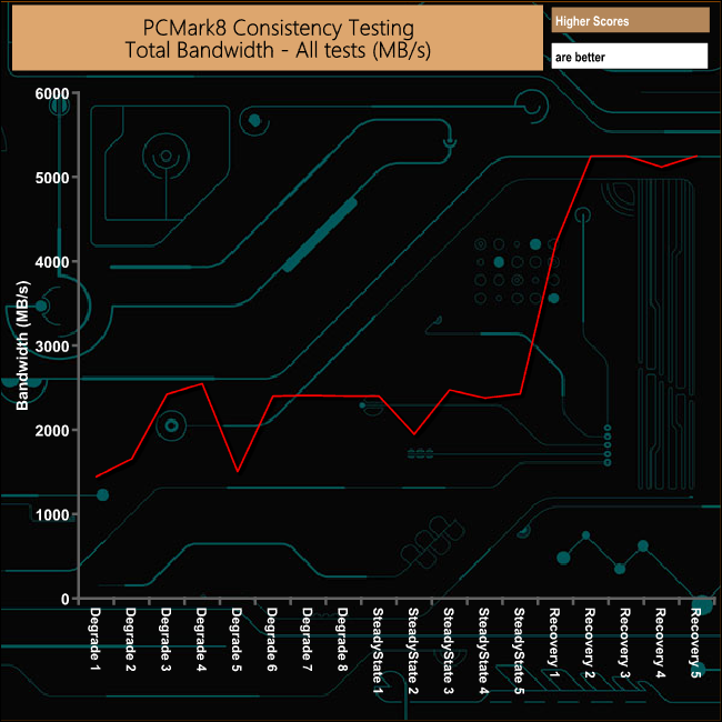 Overall in PCMark 8's Consistency test, the drive suffered in the Degradation and SteadyState phases, but the recovery phases for the NM600 were very good indeed.