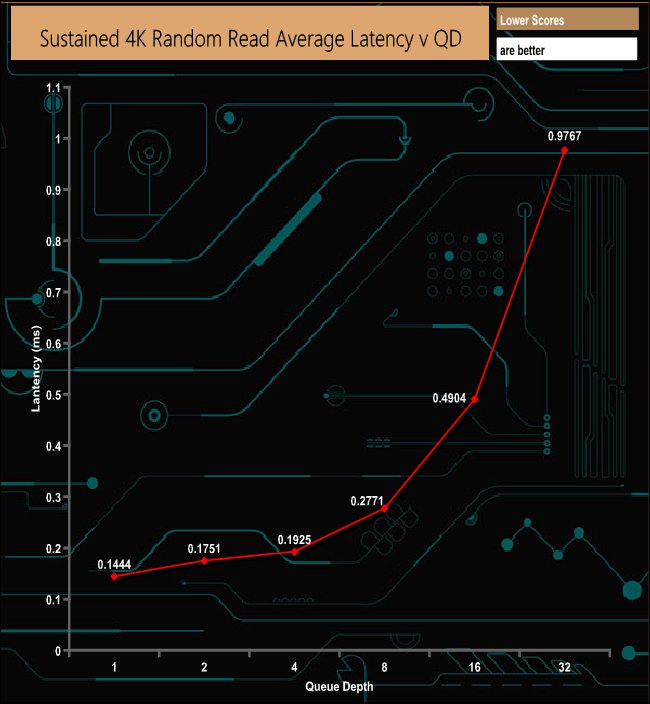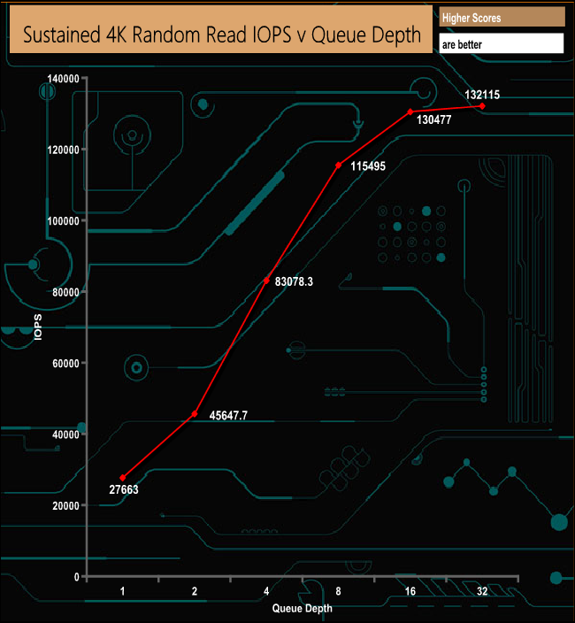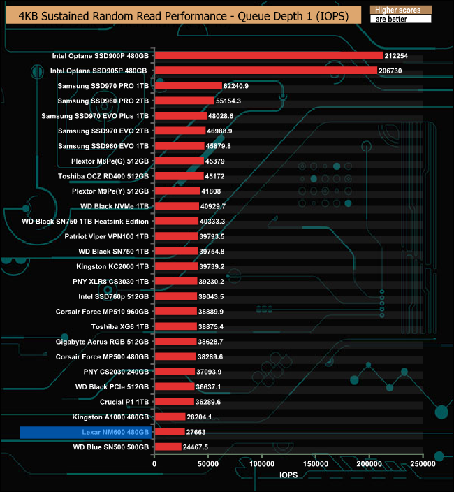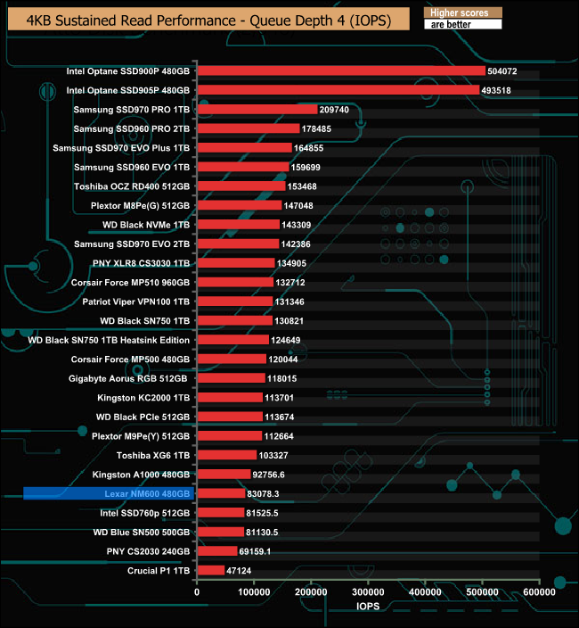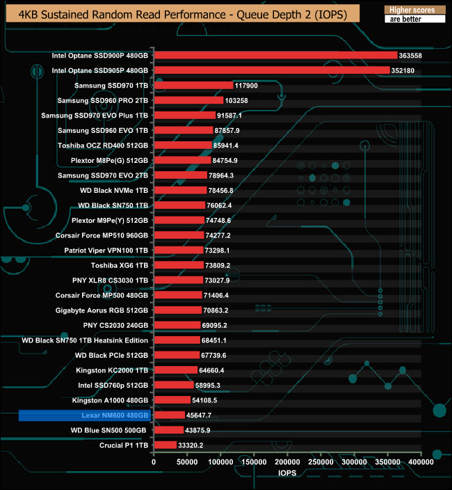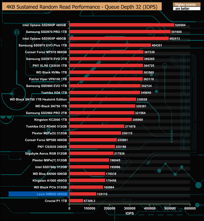 Lexar quote random 4K performance for the 480GB NM600 as up to 188,000 IOPS. With our standard 4 thread testing we couldn't get close to that figure, the best we saw was 132,115 IOPS at a QD of 32. However, a quick test at QD32 with 8 threads saw the random read performance rise to 150,208 IOPS, still short of the official maximum figure.