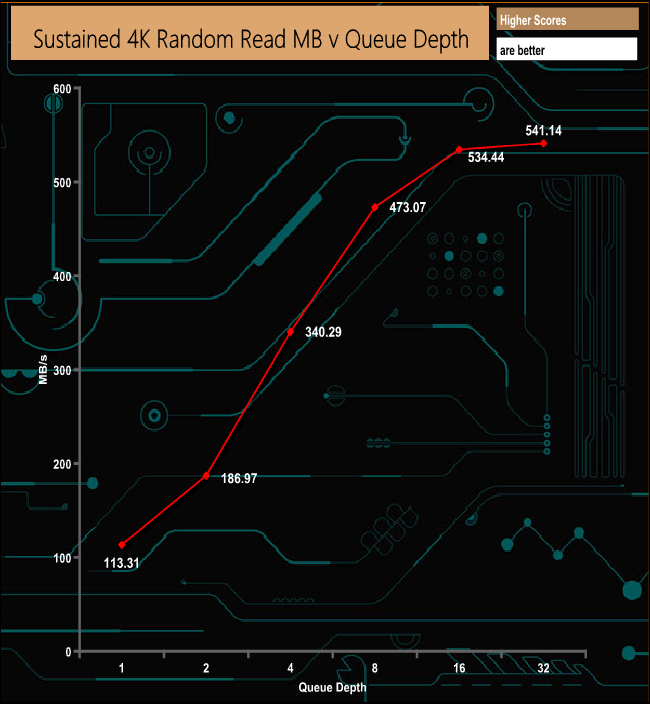 The drive didn't handle our 4K random read test very well at all even at QD's 1 & 2, however it must be said that the performance picked up at a QD of 4 at 83,078 IOPS before dropping back at a QD of 32.