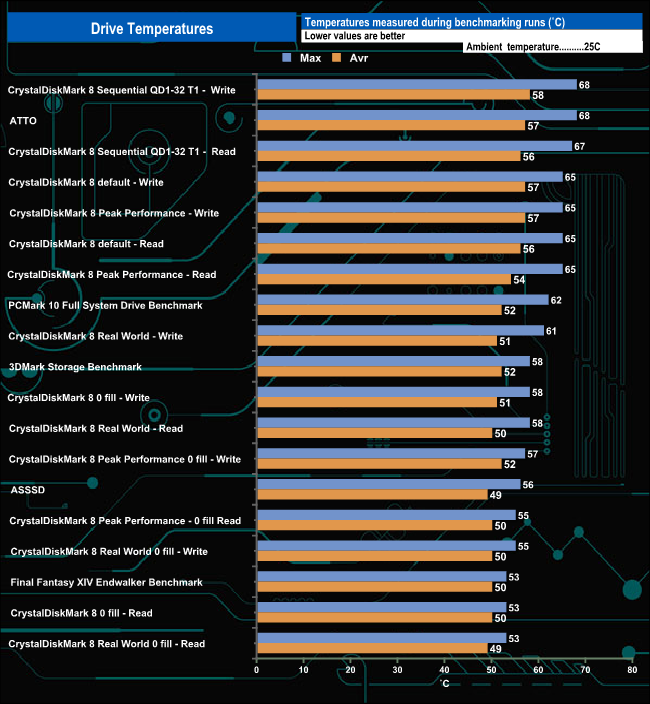 During our benchmarking runs, the hottest the drive got was 68° C during CrystalDiskMark 8 Sequential QD1-32 T1 Write test and the ATTO test, which is only 2°C away from the stated maximum operating temperature of 70°C, which is very close for comfort. But despite this, we didn't appear to see any throttle back during our tests. For the non-4 K tests the drive averaged 57°C while for the 4K-based tests, the average was 54.8°C.