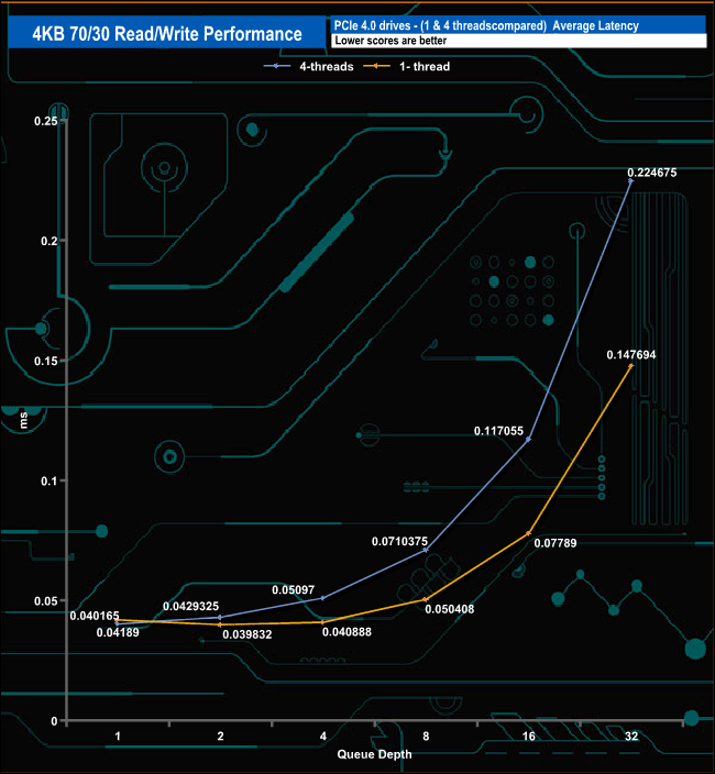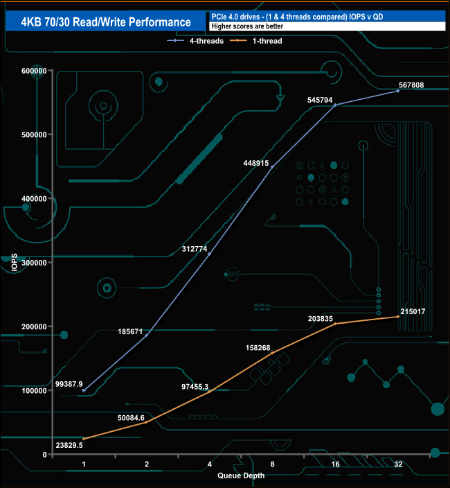 We used CrystalDiskMark 8’s custom settings to test the 4K 70/30 mixed read/write performance of the drive through a range of queue depths using a single thread and four threads.