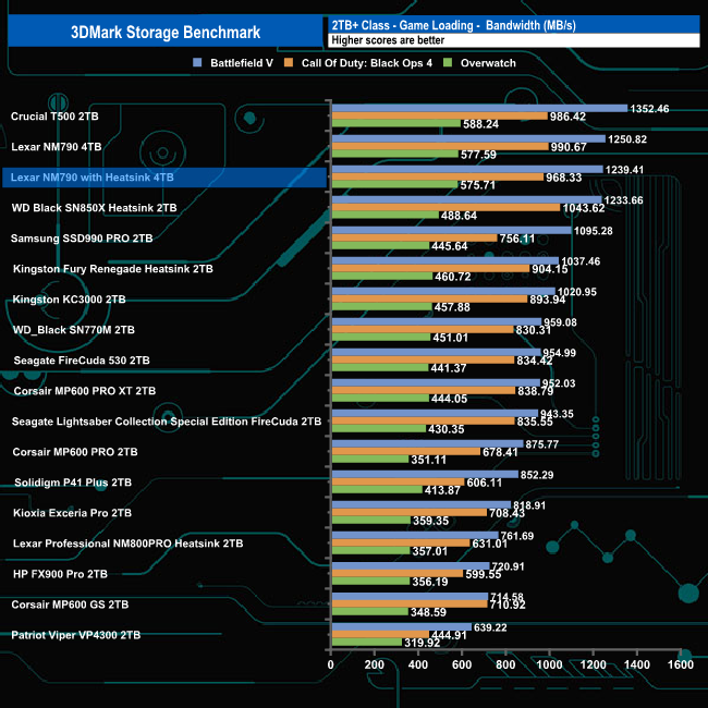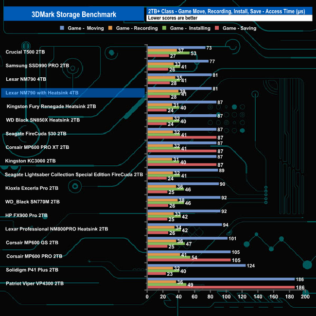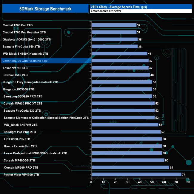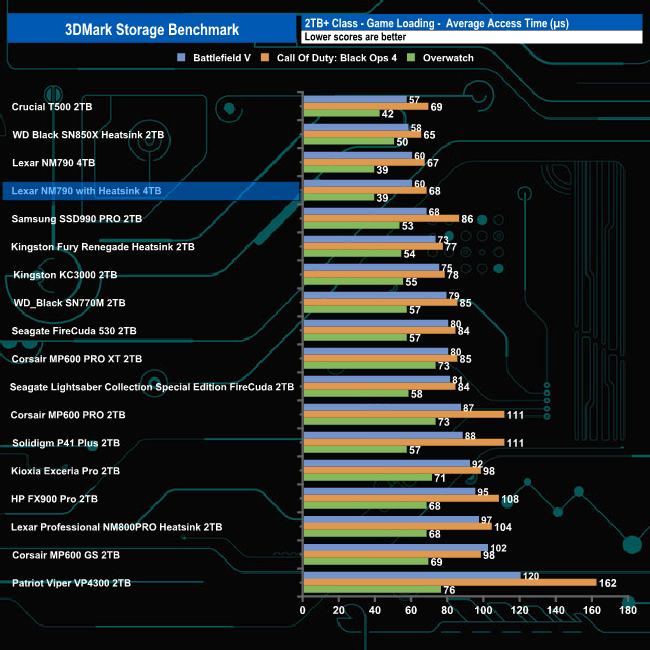 In 3DMark’s Storage Test, the NM790 with Heatsink had an average game loading bandwidth figure for the three games of 927.81MB/s which is the the third fastest average for a Gen 4 drive behind the standard NM790 and Crucial's T500. The average access time for the three game traces was 55.66µs.