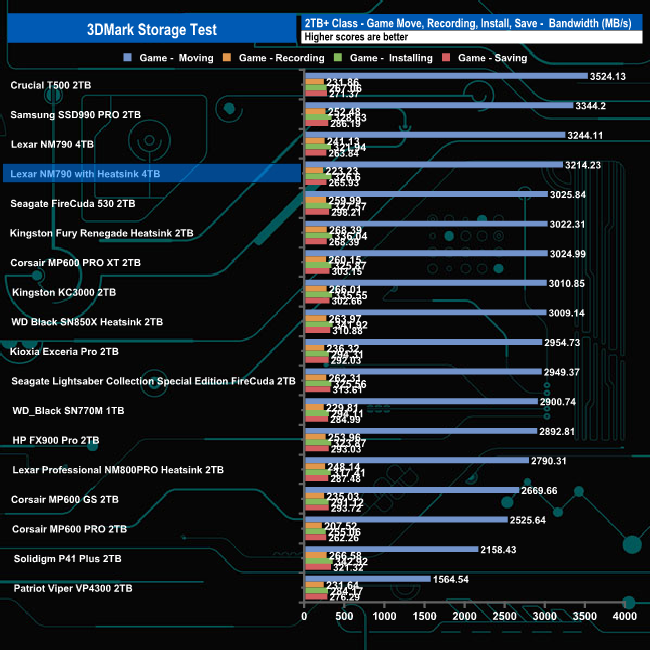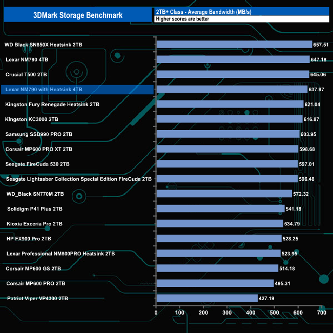 The average bandwidth for the 4TB Lexar NM790 with Heatsink for the complete benchmark run was 637.97MB/s just slightly slower than the standard NM790 drive.