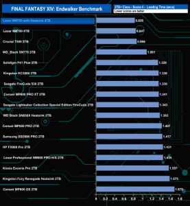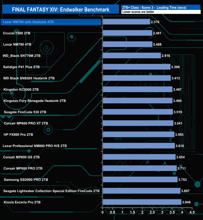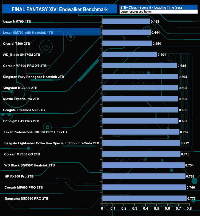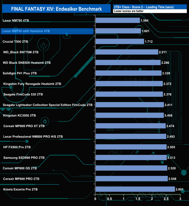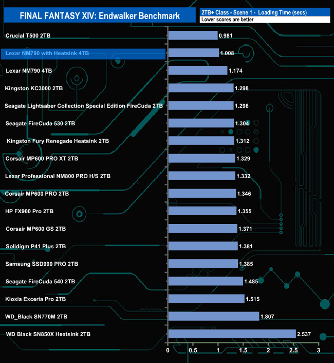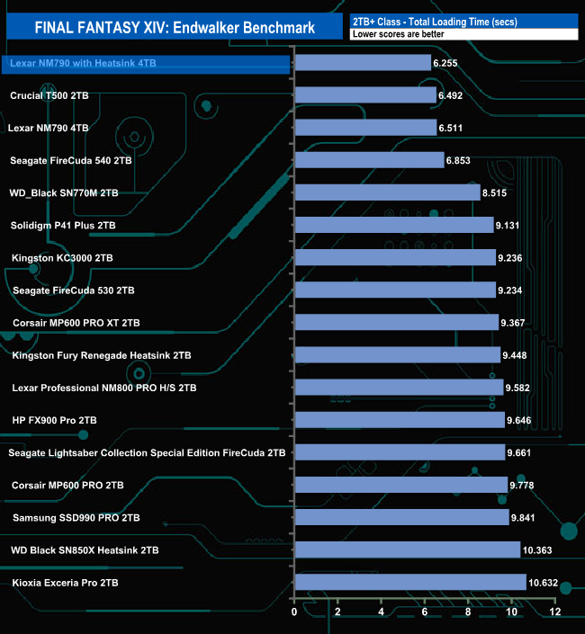 Lexar's NM790 with Heatsink does very well in the Final Fantasy XIV Endwalker Official Benchmark. As well as topping the total time chart it also tops two of the five Scene loading times and sits in second place in the other three.