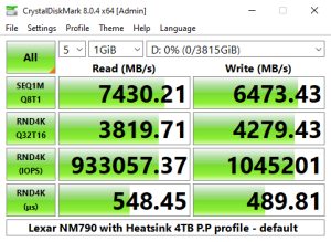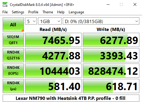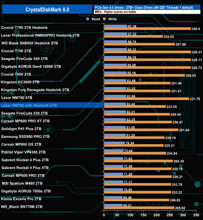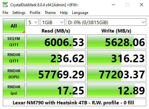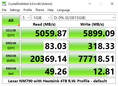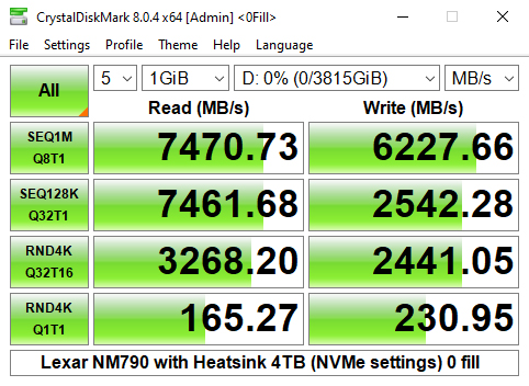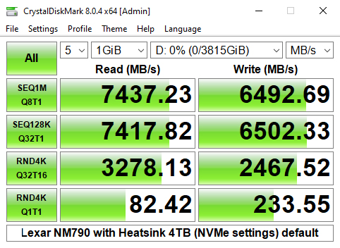 Using the CrystalDiskMark 4K QD1 1 thread benchmark, the read score of 82.42MB/s for the Lexar NM790 with Heatsink is a little slower than the standard drive we looked at. When it came to write performance our review sample was a lot slower than the standard NM790 we tested previously.