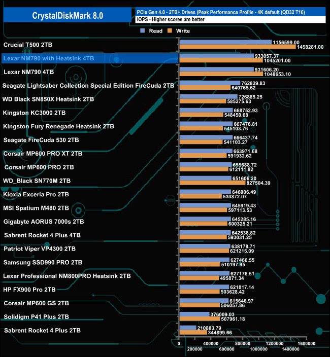 We haven't seen an official 4K random performance rating for the NM790 with Heatsink but the controller specs quote support up to 1,000K IOPS for both read and writes. Using the Peak Performance profile test in Crystal Disk Mark 8 we saw a best-read result of 933,057 IOPS, a little slower than the controller rating with writes at 1,045,201 IOPS, a little faster than the official figure. The figures were good enough to see the drive sit in second place on the results chart.