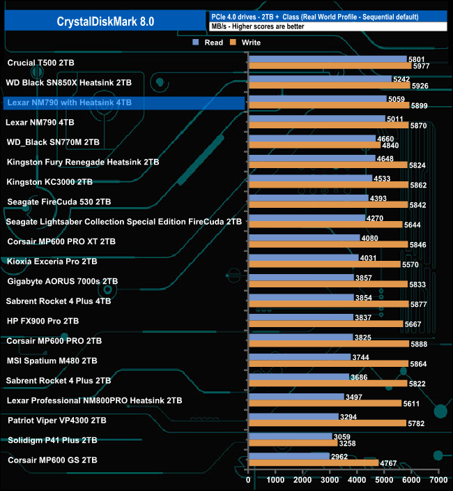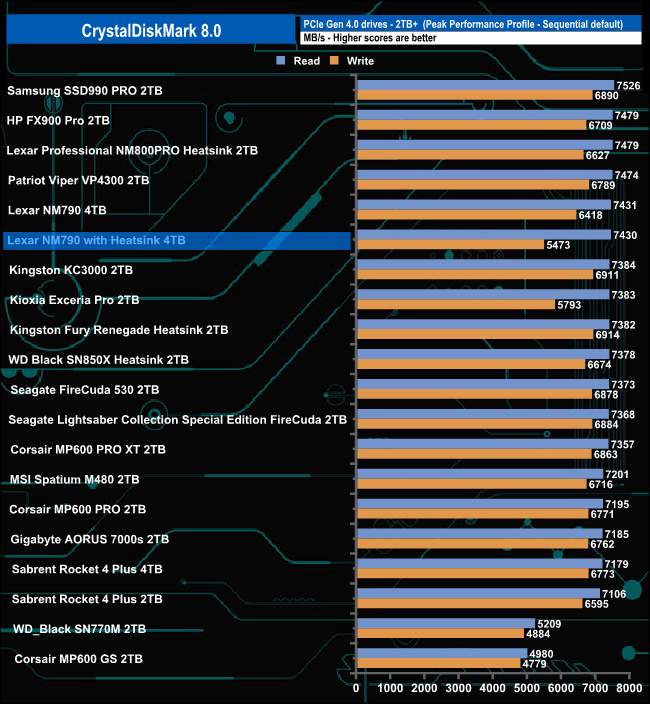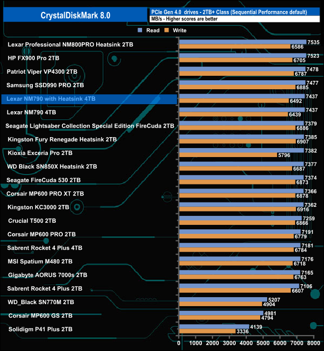 Those Sequential test results of 7,437MB/s and 6,492MB/s for read and writes respectively are good enough to see the drive in the top five of the Gen 4 consumer drives we've tested to date.
