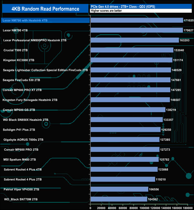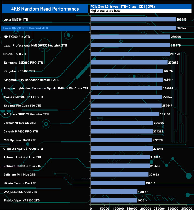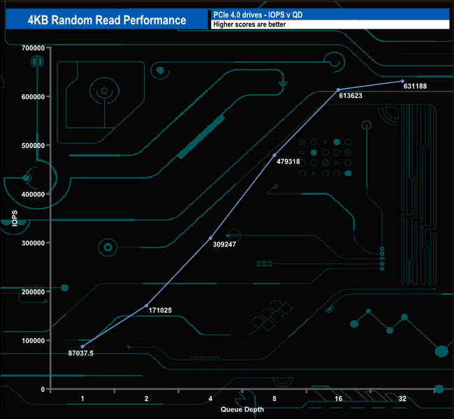 Lexar doesn't list any official 4K random performance figures on the specification sheet of the NM790 with Heatsink but the Maxiotech controller is rated as up to 1,000K IOPS for random reads. Using our 4-threaded tests we couldn't get close to that figure. The best we saw from our test runs was 631,188 IOPS at QD32.