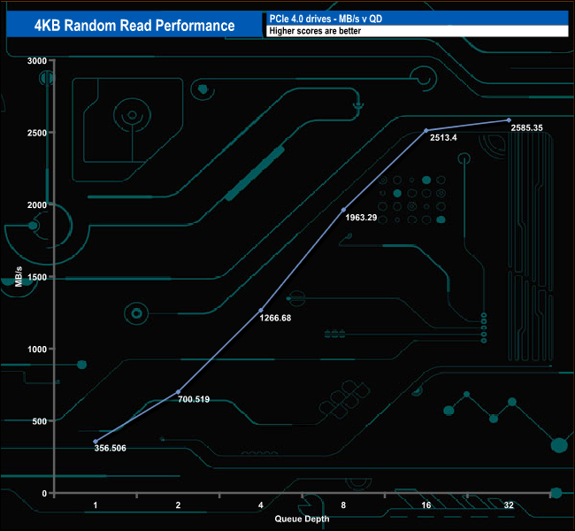 We used CrystalDiskMark 8‘s custom settings to test the 4K random read performance of the drive through a range of queue depths. The setup for the tests is listed below.