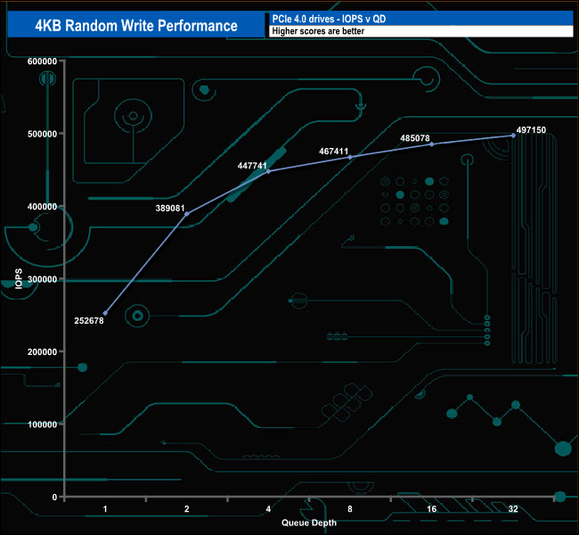 The Maxiotech controller is rated as up to 1,000K IOPS for random writes. As with the random read results with our 4-threaded tests, we couldn't get close to this figure with the best test result of 497,150 IOPS at QD32.