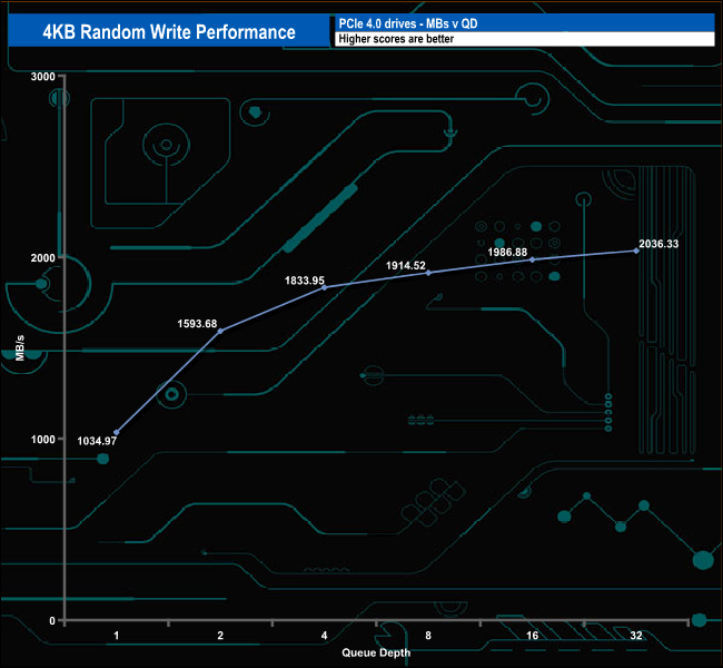 We used CrystalDiskMark 8‘s custom settings to test the 4K random write performance of the drive through a range of queue depths. The setup for the tests is listed below.