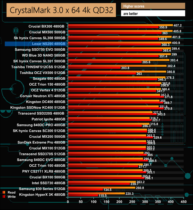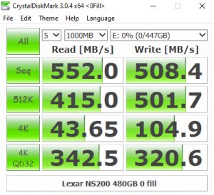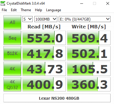 The Lexar NS200 handles the CrystalDiskMark benchmark very well indeed. Looking at the two benchmark screens it seems that the Silicon Motion SM2258 controller doesn't really have a preference for what type of data it's being asked to work with.
