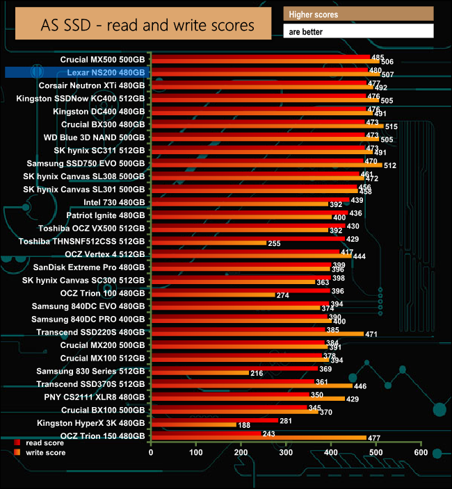 The NS200 is a quick drive. Its read score in the AS-SSD benchmark of 480 is good enough to put the drive into second place in our charts, while its write score of 507 is the third best we have seen to date for a consumer SATA based SSD.