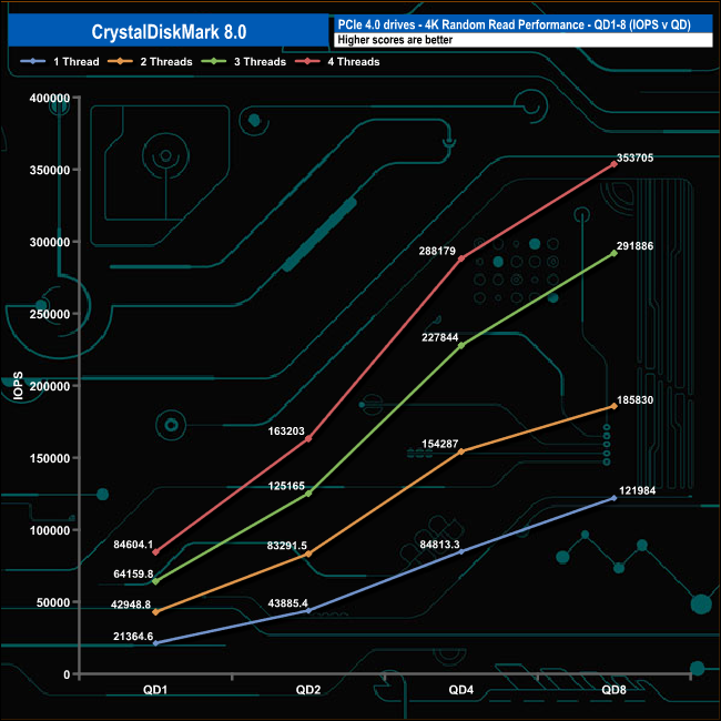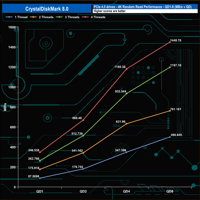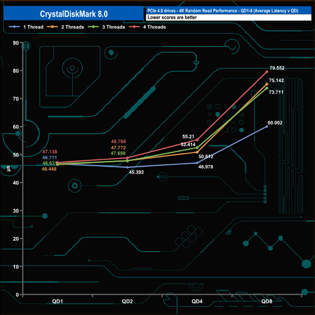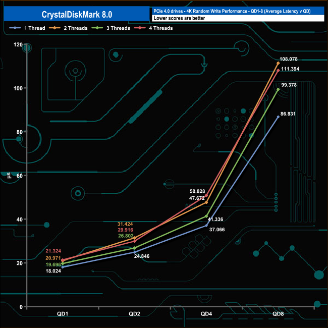 We used CrystalDiskMark 8 to test the random performance of the drive at lower queue depths (QD1 – QD8 where most of the everyday workloads occur) using 1 to 4 threads.