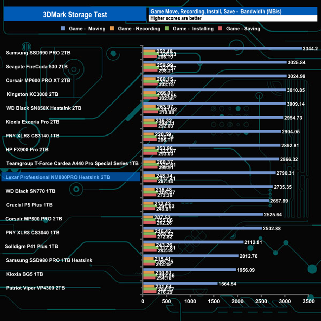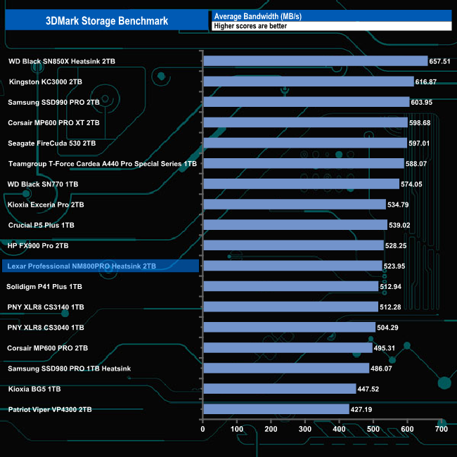 In 3DMark's Storage Test, the drive had an average bandwidth figure of 583.23MB/s for the three-game load tests and an overall average bandwidth for the complete test run of 523.95MB/s.