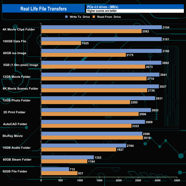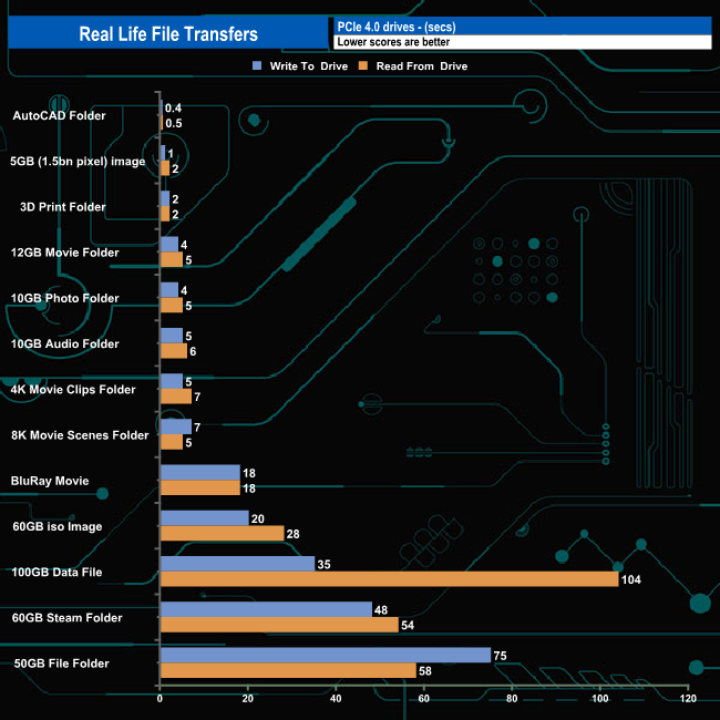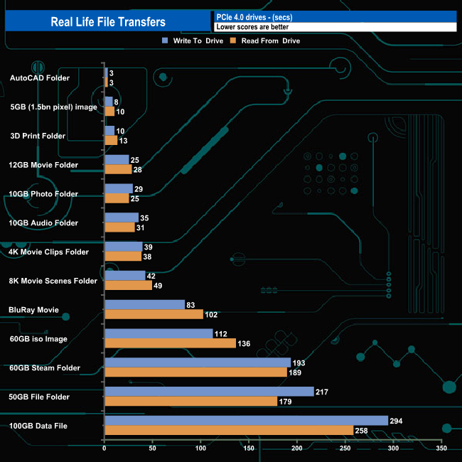 Swapping over to an all NVMe architecture saw transfer speeds rocket and transfer times slashed as you might expect. Six out of the thirteen tests topped 3GB/s when writing the data and nine topped 2GB/s when reading the data back. The drive seemed to struggle a bit when reading the 100GB data file, however, the write performance was very good. The slowest transfers were once again came from the 50GB file folder with 931MB/s for reads and 715MB/s for writes.