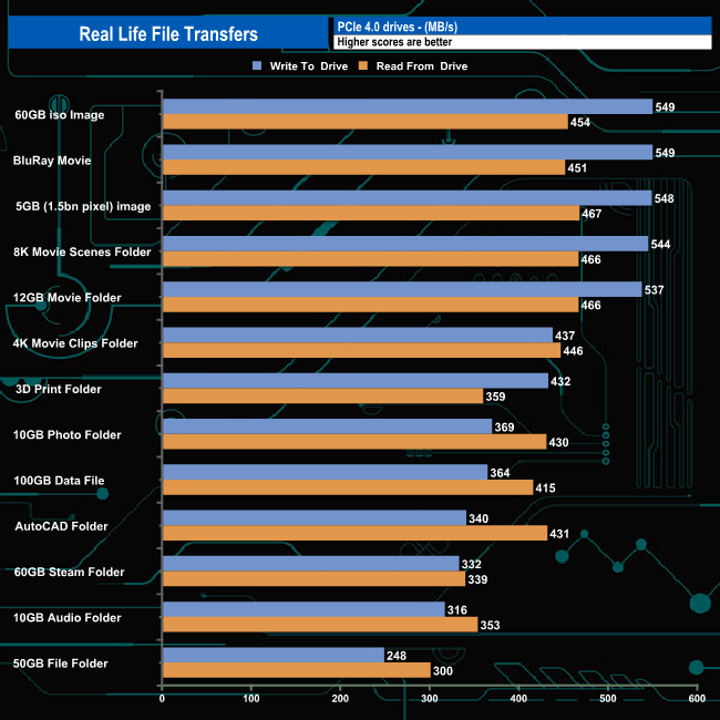 The drive handled our real-life file transfers without any problems. It averaged 527MB/s when writing large files and 458MB/s when reading the same data back. The fastest write transfer speed was the 549MB/s from the 60GB iso and BluRay movie. The fastest read performance was from the 5GB image transfer at 467MB/s. The slowest transfer for both reads and writes was the 50GB folder at 300MB/s and 248MB/s respectively.