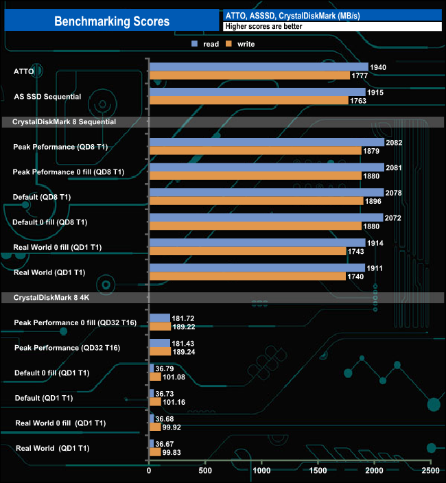 Lexar quote transfer speeds of up to 2,000MB/s and up to 1,800MB/s for reads and writes respectively. Using the ATTO and AS SSD benchmarks the drive came up a little short of these official maximums. The best read scores we saw were 1,940MB/s and 1,915MB/s for ATTO and AS SSD respectively with writes at 1,777MB/s for ATTO and 1,763MB/s for ASSSD. Switching over to the CrystalDiskMark 8 benchmark the drive gave up a best-read score of 2,082MB/s (Peak Performance default profile) with 1,896MB/s for writes (default-test) so confirming the official figures.