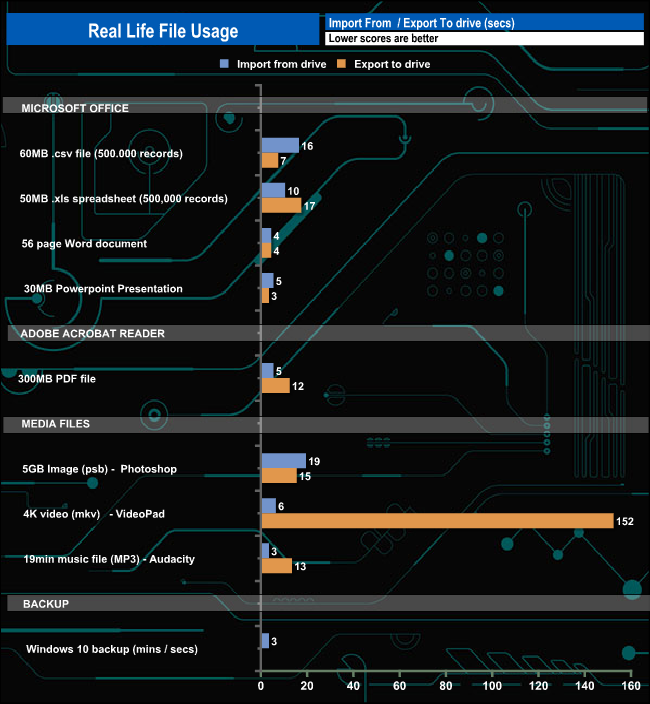 We also timed moving a Win 10 backup file to and from the drive and launching a game from the XXX.