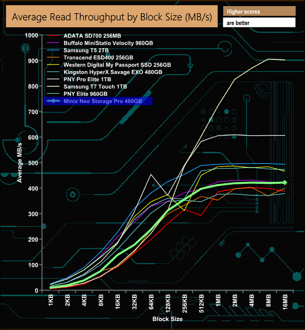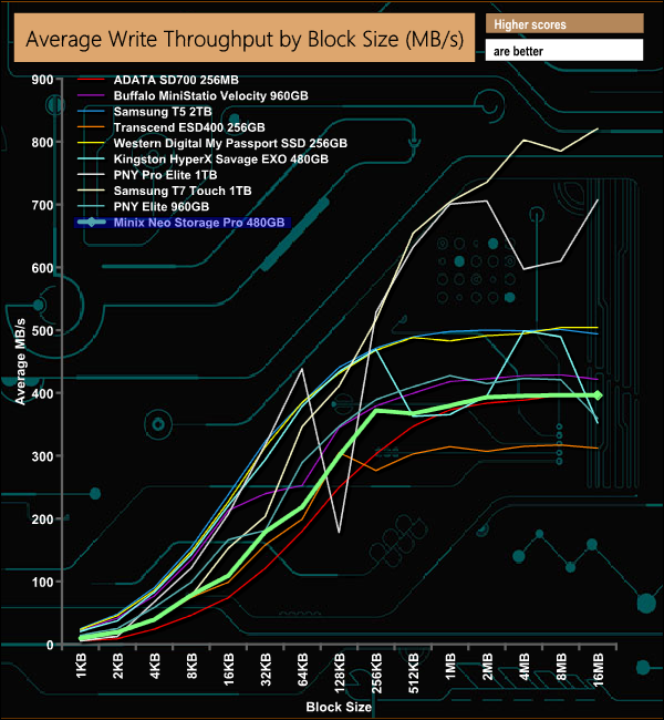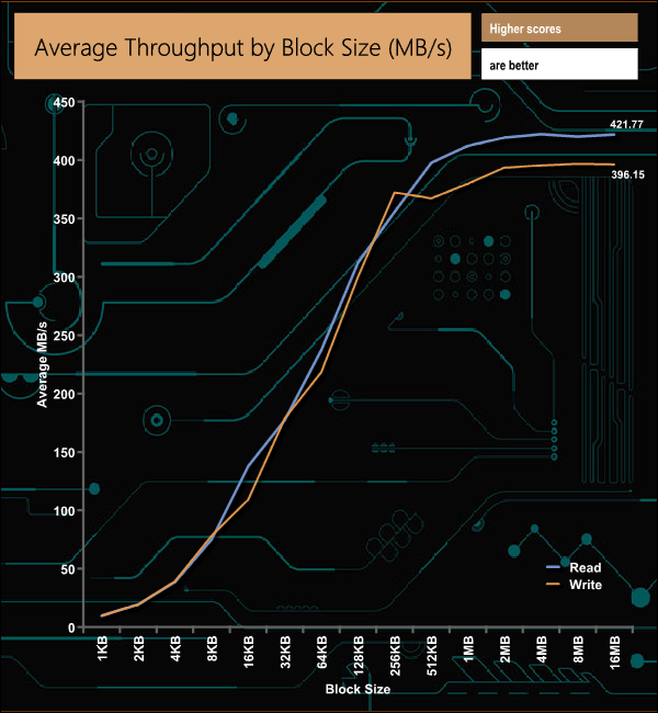 In our throughput tests, we did a little better than the official 400MB/s for reads, the drive peaking at 422.03MB/s (4MB block) but fell a wee bit short when it came to writes, which peaked at 396.65MB/s (8MB block), just below the official 400MB/s mark.