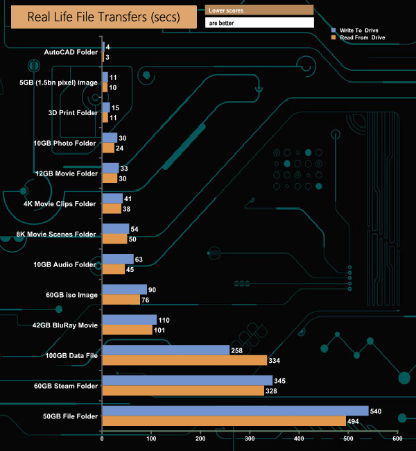 To test the real-life performance of a drive we use a mix of folder/file types and by using the FastCopy utility (which gives a time as well as MB/s result) we record the performance of drive reading from & writing to a 256GB Samsung SSD850 PRO.