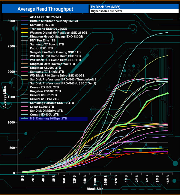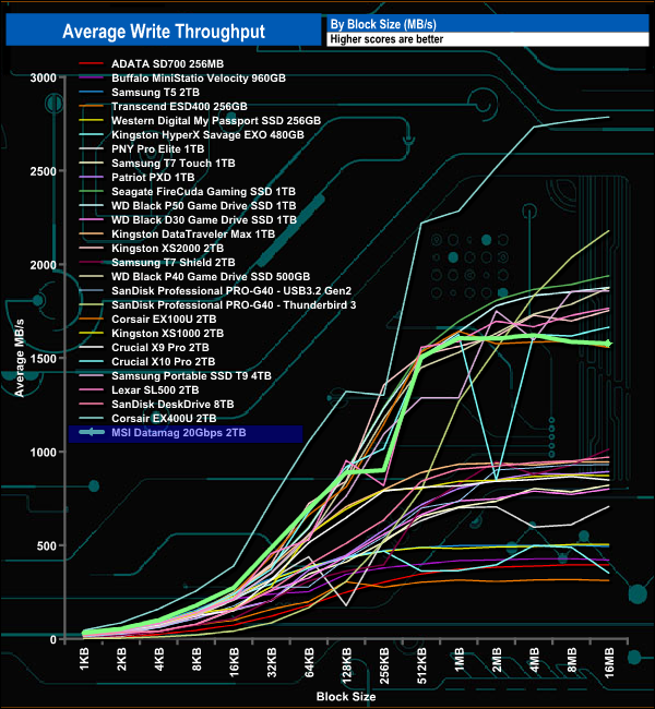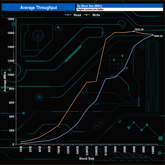 In the write throughput test, the drive's performance peaked at the 4MB block mark at 1,622.26MB/s, before dropping back to finish the test run at 1,577.49MB/s. The peak performance is some 122MB/s faster than the official write figure.