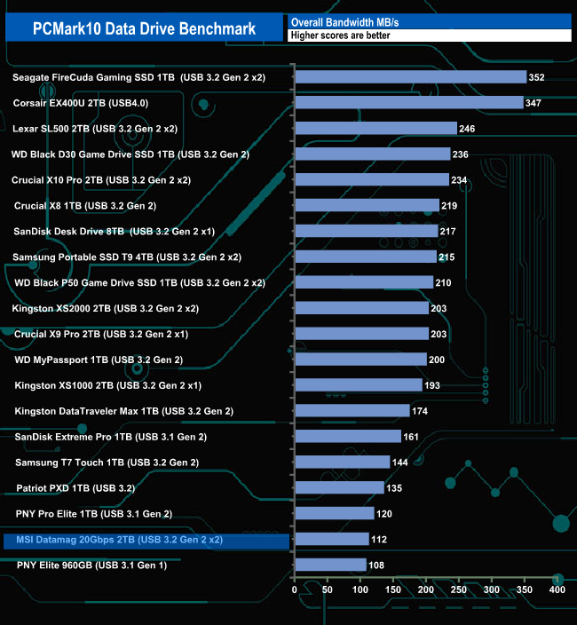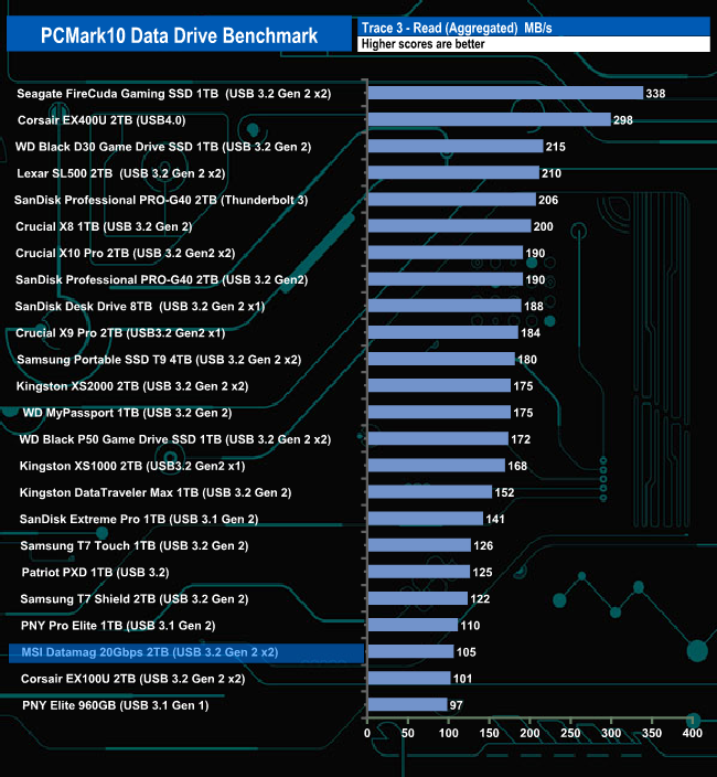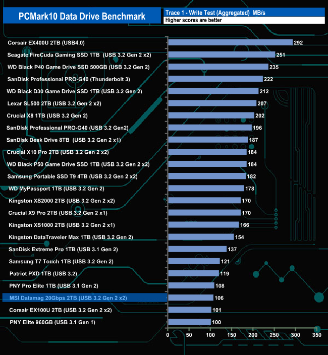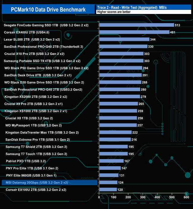 The Datamag 2TB drive doesn't seem to handle the rigours of the PCMark 10 Data Drive Benchmark very well. It sits close to the last position in all three trace tests and in the overall benchmark chart.