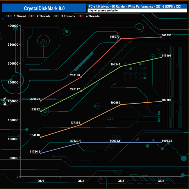The 2TB MSI Spatium M480's 4K read performance climbs smoothly throughout the tested queue depths and threads. At QD1 the performance of the drive ranges from 17,295 IOPS (70.84MBs) using a single thread up to 67,207 IOPS (275.28MB/s) using four threads.