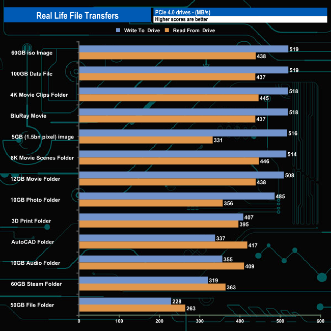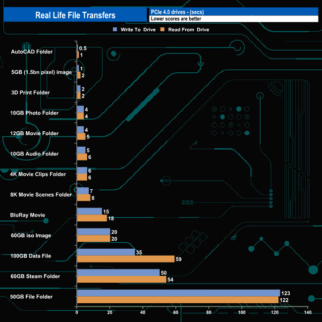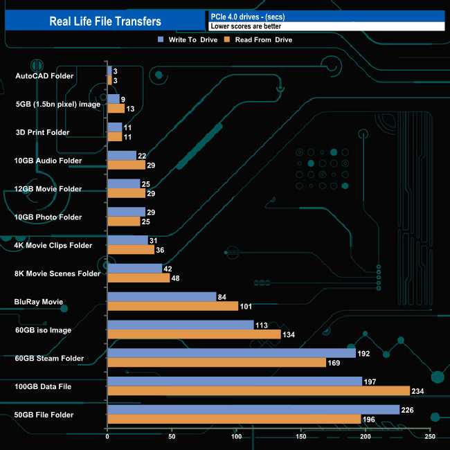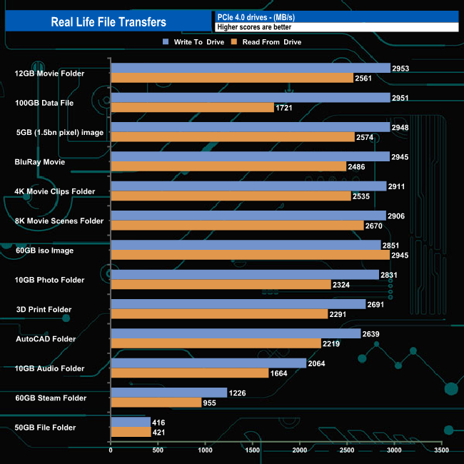 Switching over to an all NVMe storage environment we see write speeds approaching 3GB/s, the fastest being the 2,953MB/s when writing the contents of the 12GB Movie folder. Eleven of the thirteen transfers were over 2GB/s for writes with nine over 2GB/s reads. The performance when the drive was reading the 100GB Data file was very much slower than all the other large data reads.