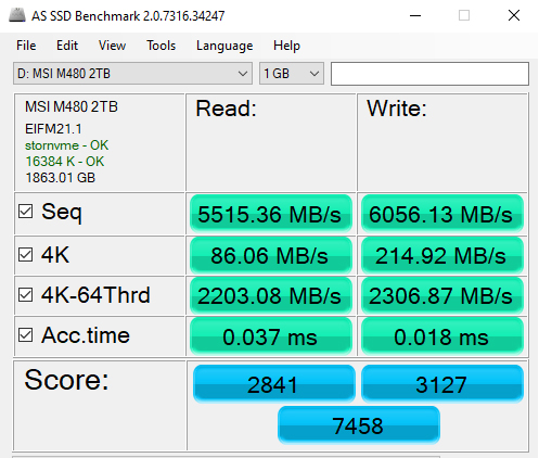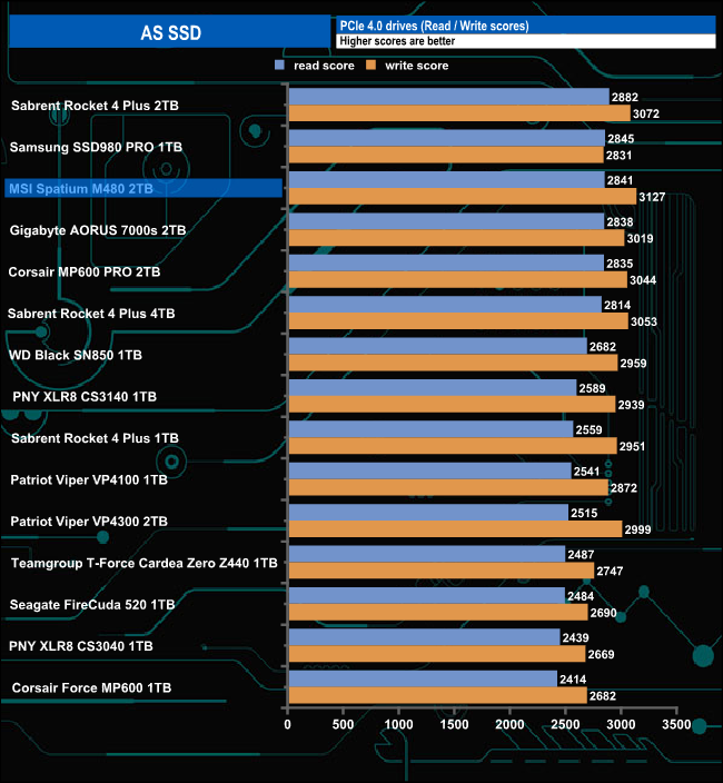 The Spatium M480's read score of 2841 puts the drive into third place on the results chart but the write score of 3127 is the fastest we've seen to date for a consumer Gen 4 drive.
