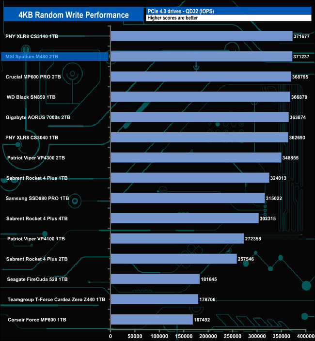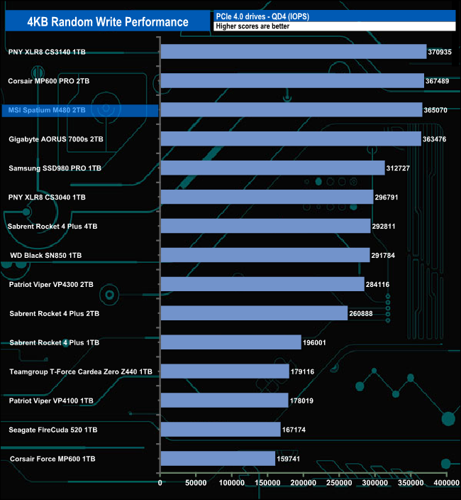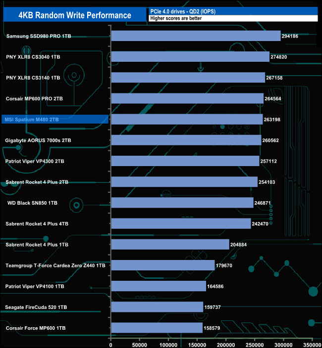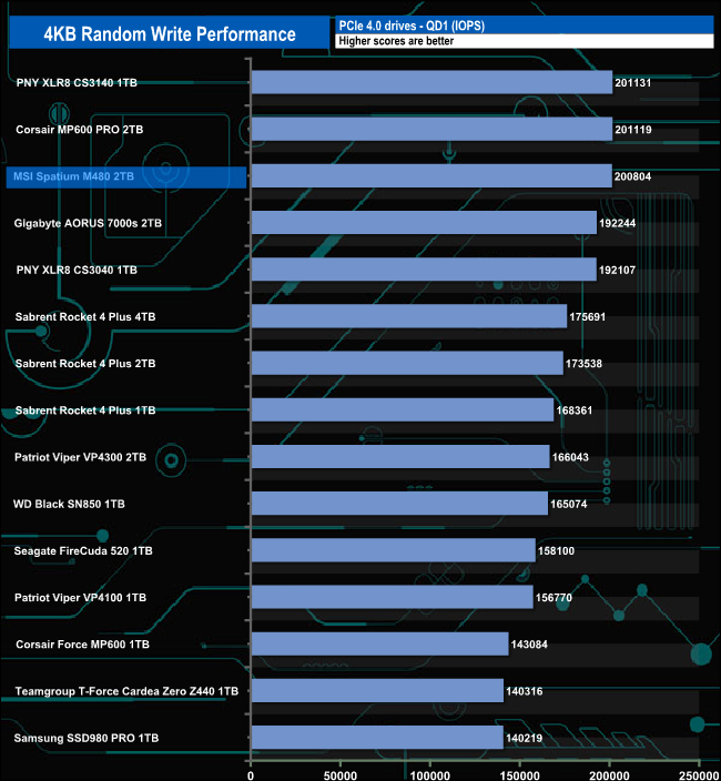 Although we couldn't match the official random write figure with our 4-threaded testing, the MSI Spatium M480 is still a fast drive when it comes to random writes. There is only one tested queue depth, QD2, where the drive doesn't sit in the top three in the results charts.