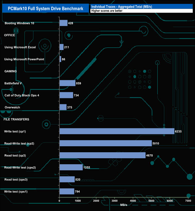 The three gaming traces produced an average result of 656MB/s, the fastest being Battlefield V at 859MB/s, next came Call of Duty Black Ops 4 at 734MB/s and last, Overwatch at 375MB/s. The drive averaged 3,130MB/s for the six file transfer tests, the fastest being 6,235MB/s for the cp1 read test.