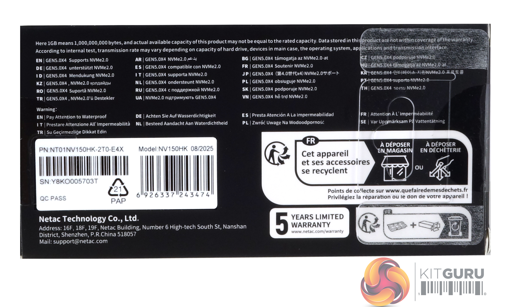 The top half of the rear of the box is covered in multilingual details about the interface – Gen5 x4 NVMe 2.0. At the bottom edge of the box is a panel displaying the fact that a five-year warranty backs the drive.