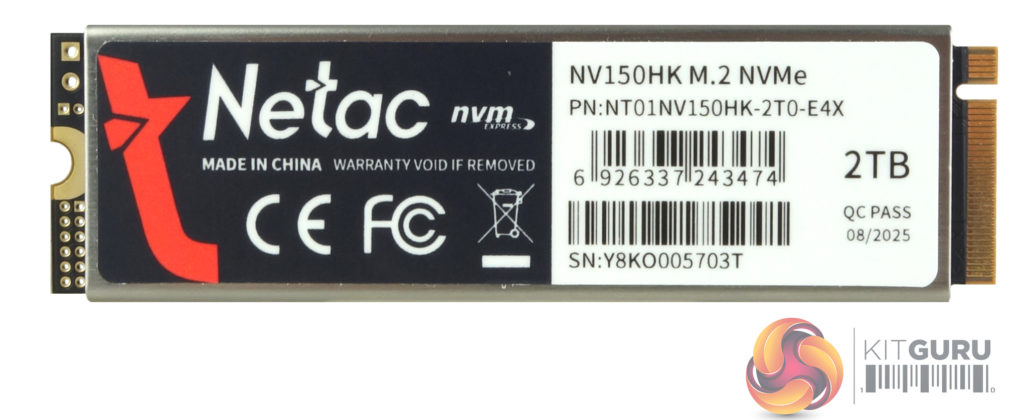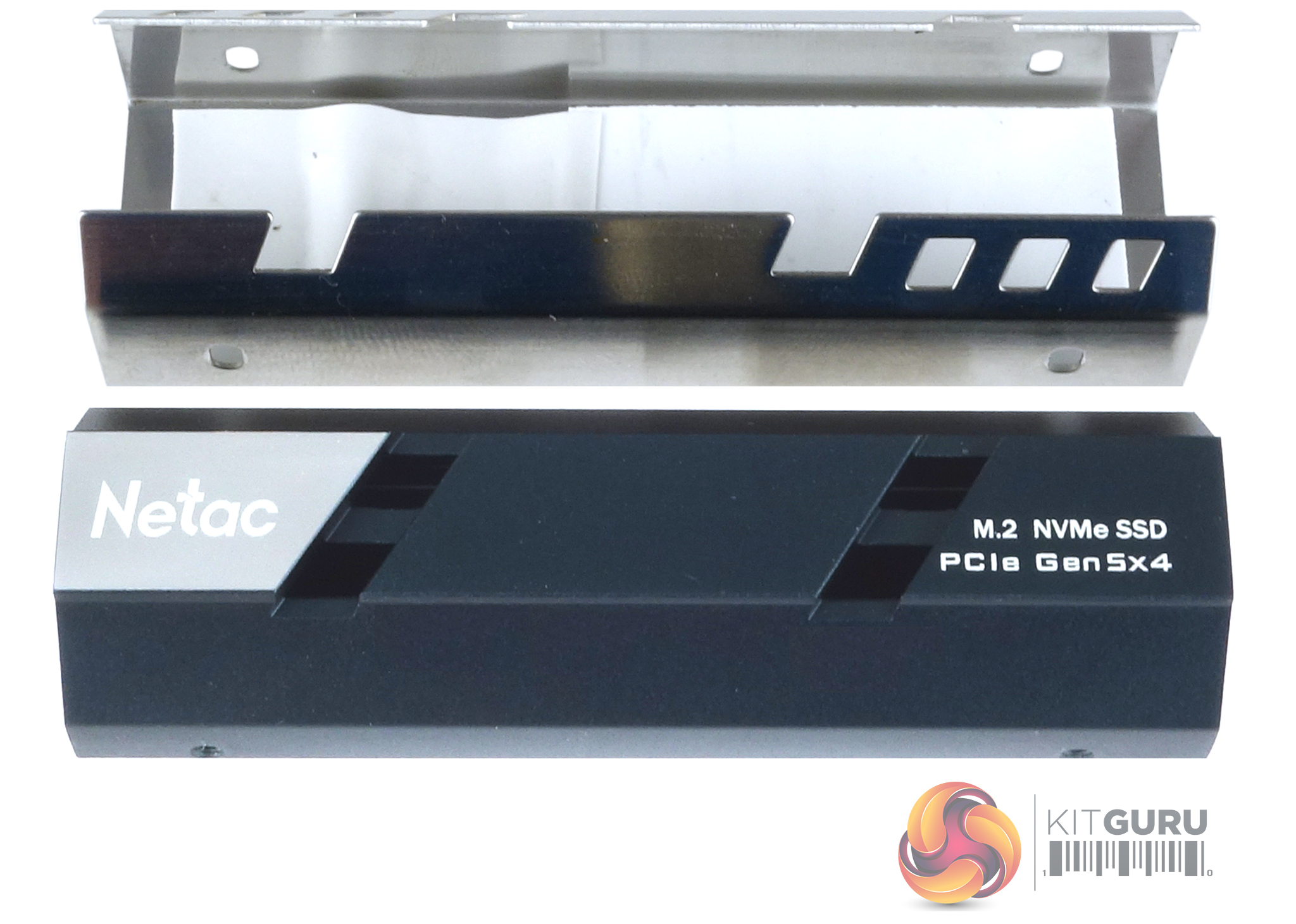 Netac have used a two-piece heatsink design with the NV150HK, the finned heatsink itself (weighing in at 32g), which is held in a chrome-finished cradle by four tiny screws. The drive is sandwiched between two fairly thick thermal pads.