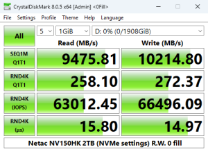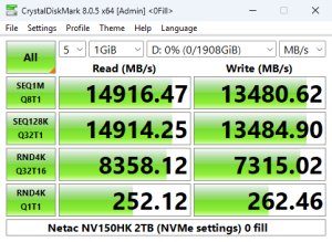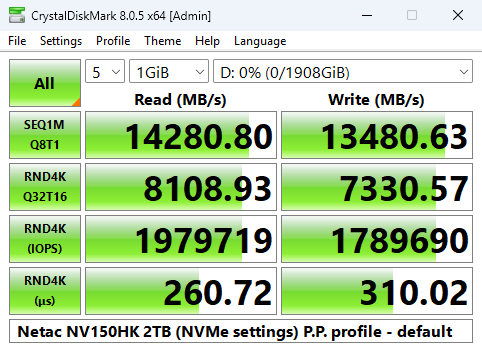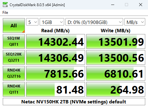 Looking at the benchmark result screens, we could confirm the official Sequential maximums and even better them a little, of up to 14,000MB/s & 13,000MB/s respectively for read and writes, with test results of 14,302MB/s for reads and 13,501MB/s for writes.