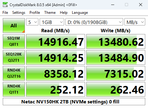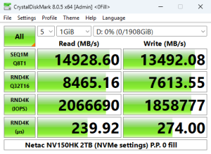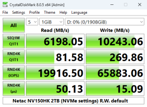 Using the default settings for the 4K QD1 CrystalDiskMark 8 test, the 2TB NV150HK read score of 81.48MB/s sees it in last place in our results chart. Switching to the compressed data test, the read performance increased across the board, especially the 4K QD1 T1 test, with the only real improvements in writes coming from the 4K QD32 T16 test.