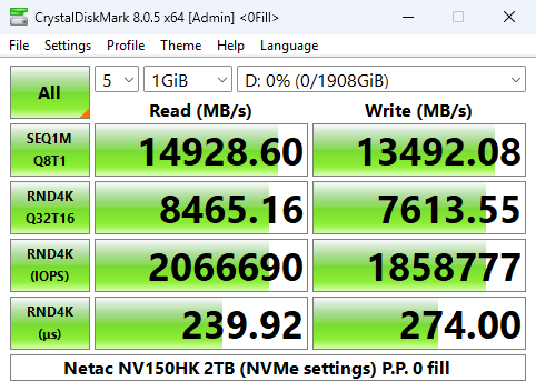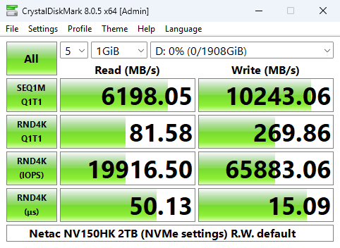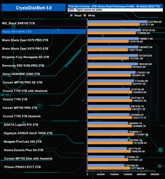 Netac quotes random 4K maximums of up to 2M IOPS for reads and up to 1.8M IOPS for writes. Using the default Peak Performance profile of CrystalDiskMark 8, we couldn't quite hit the official maximums with test results of 1,979,719 IOPS for reads and 1,789,690 IOPS for writes. Switching over to the compressed data test, the read/write scores improved to confirm, and better, the official figures with a read result of 2,066,690 IOPS with writes at 1,858,777 IOPS.