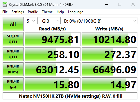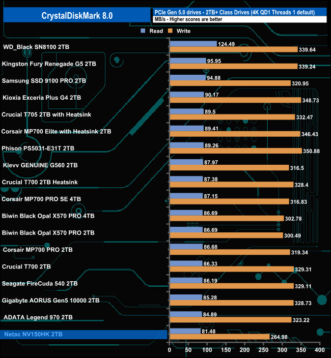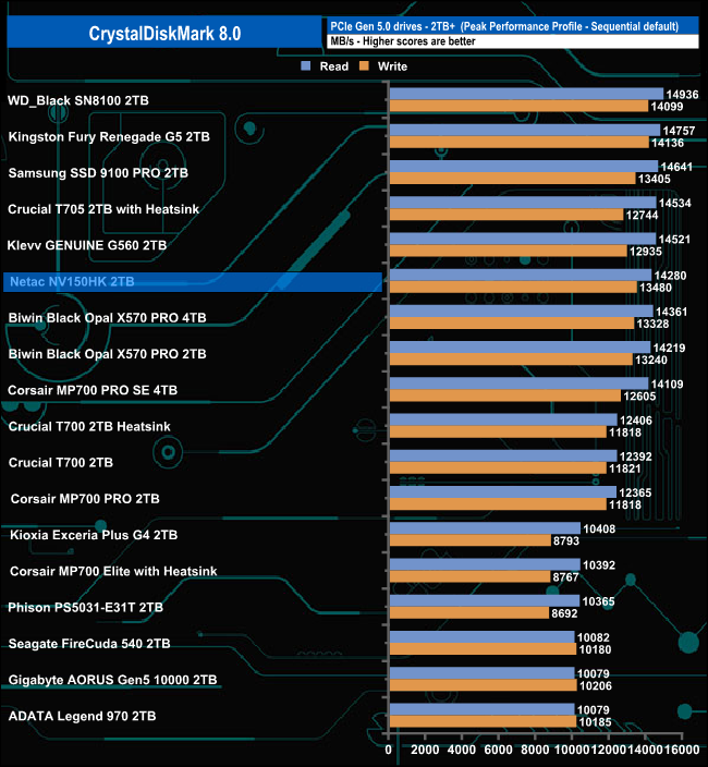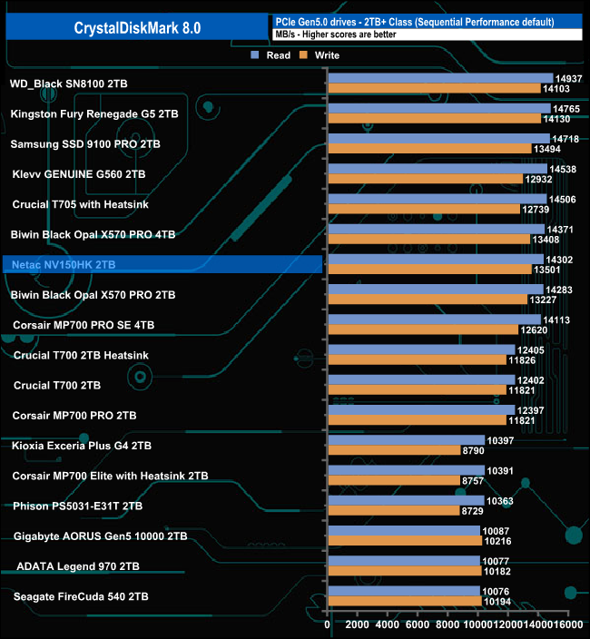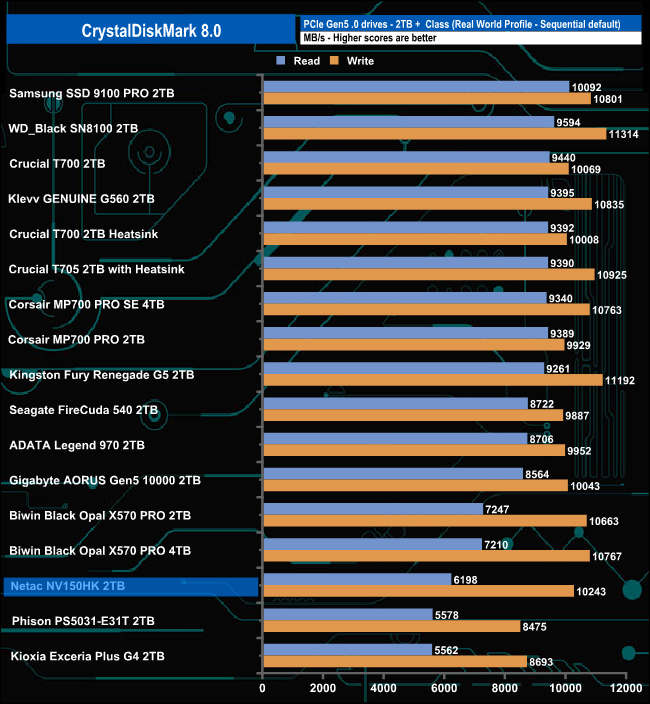 The Netac's NV150HK read score of 14,302MB/s sees the drive slip into seventh place on the results chart. Its write score of 13,501MB/s is the third fastest we've seen to date for a Gen 5 consumer drive.