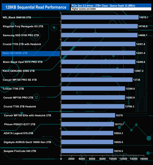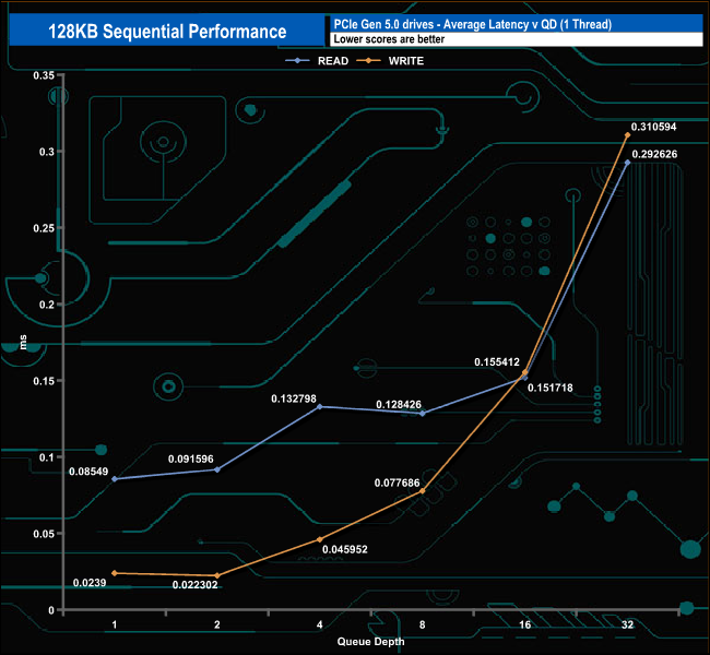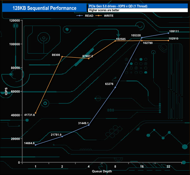 We used CrystalDiskMark 8‘s custom settings to test the Sequential read and write performance of the drive through a range of queue depths. The setup for the tests is listed below.