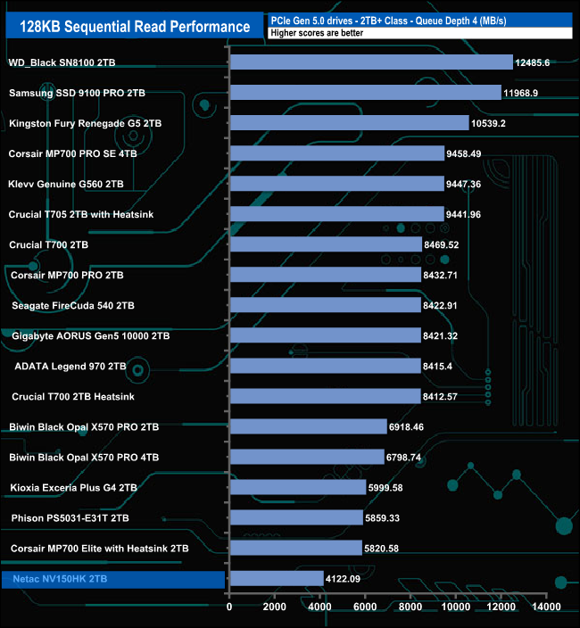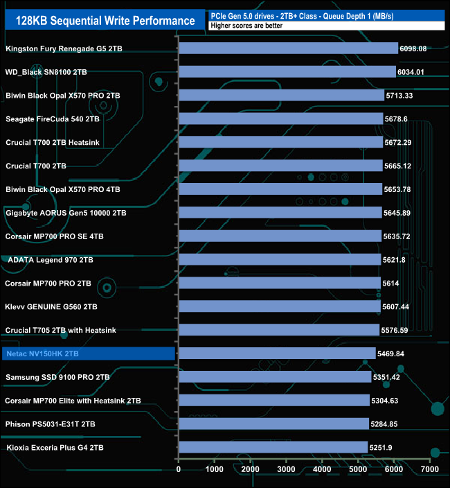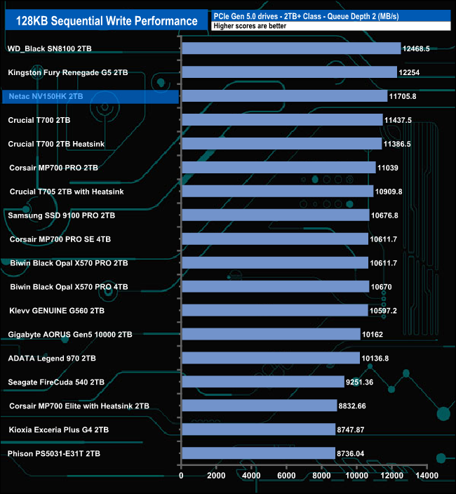 When it came to Sequential writes, at queue depth 1, the drive sits in the bottom half of the results chart. At QD2, the drive's performance sees it climb into third place behind WD's Black SN8100 and Kingston's Fury Renegade G5 drives. At QD4, the drive has dropped into a mid-table position, but at QD32 the drive sits in third place again.