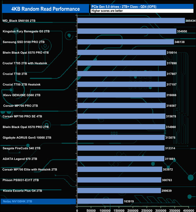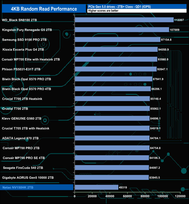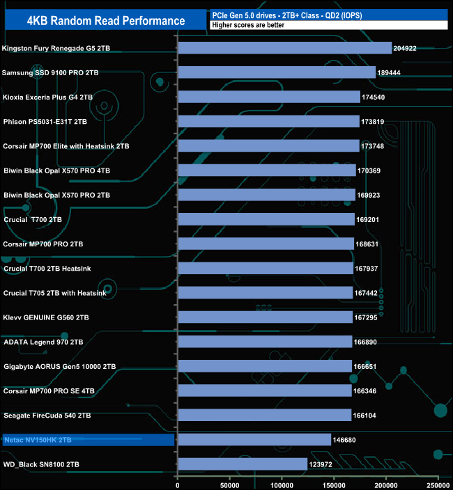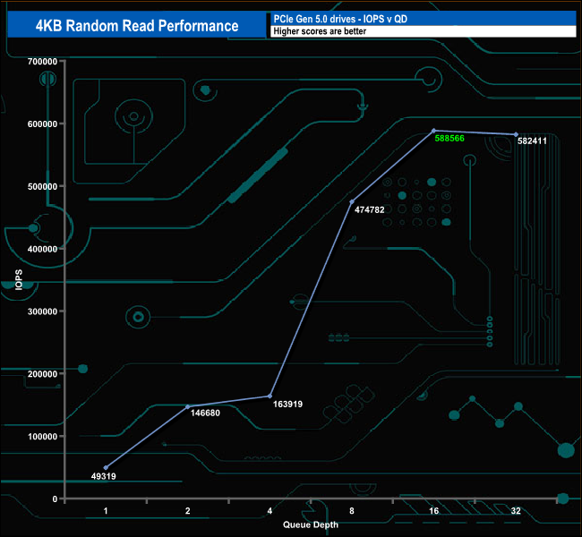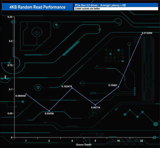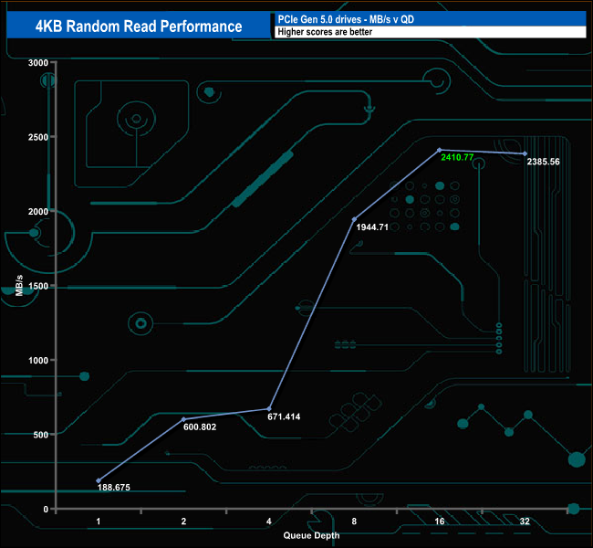 At queue depths, QD1 and QD4, the drive sits in last place and at QD2, it sits in penultimate place. But at QD32, the drive has rocketed up the chart to sit in second place behind WD's Black SN8100 drive.