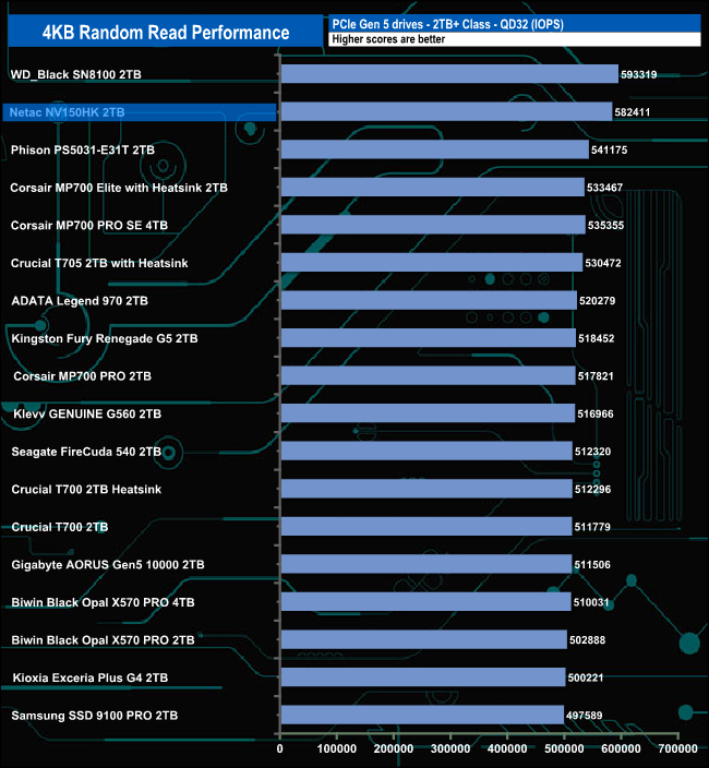 Netac rate the 4K random read performance of the NV150HK at up to 2M IOPS. Using our four-threaded test, we couldn't get close to that figure. The fastest performance we saw from the drive was 588,566 IOPS (QD16) before dropping back to 582,411 IOPS at the end of the test.