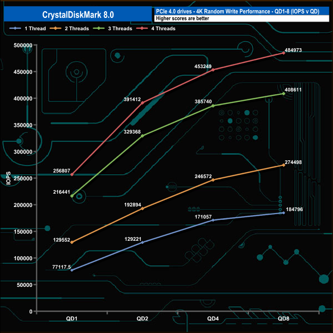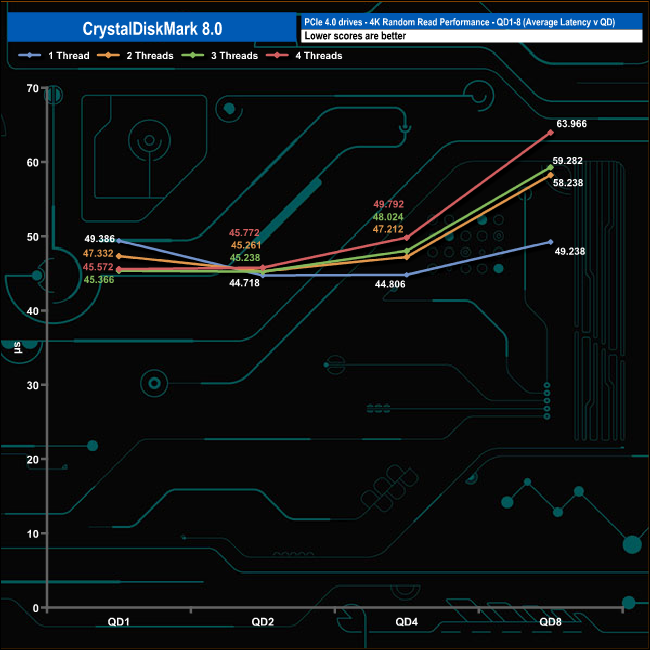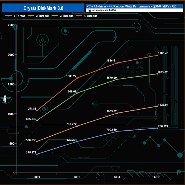 We used CrystalDiskMark 8 to test the random performance of the drive at lower queue depths (QD1 – QD8 where most of the everyday workloads occur) using 1 to 4 threads.