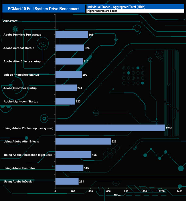 The PCMark 10 Full System Drive Benchmark uses a wide-ranging set of real-world traces from popular applications and common tasks to fully test the performance of the fastest modern drives. The benchmark is designed to measure the performance of fast system drives using the SATA bus at the low end and devices connected via PCI Express at the high end.